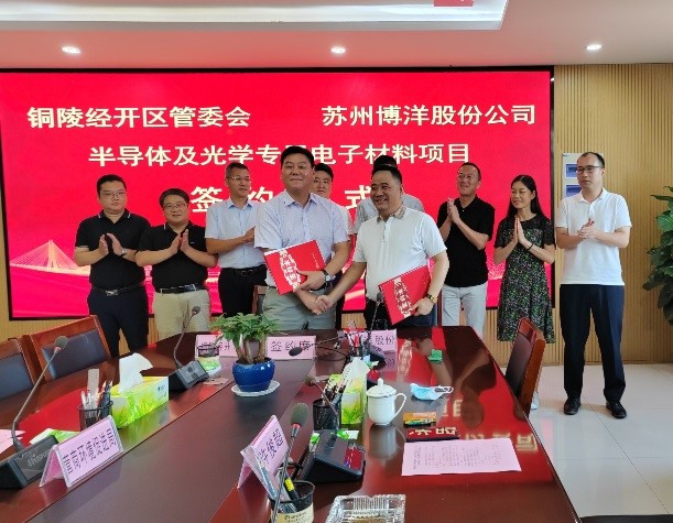 近日,銅陵經(jīng)開(kāi)區(qū)舉行半導(dǎo)體及光學(xué)專用電子材料項(xiàng)目簽約儀式。經(jīng)開(kāi)區(qū)黨工委書(shū)記、管委會(huì)主任古勁松,蘇州博洋化學(xué)股份有限公司董事長(zhǎng)王國(guó)洪等出席儀式。