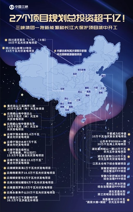 12月28日,三峽集團(tuán)宣布一批新能源和長(zhǎng)江大保護(hù)項(xiàng)目集中開(kāi)工——27個(gè)項(xiàng)目規(guī)劃總投資達(dá)1090.55億元,總裝機(jī)規(guī)模1963.68萬(wàn)千瓦,涉及三峽集團(tuán)6個(gè)二級(jí)單位投資主體,遍布全國(guó)11個(gè)省、市、自治區(qū),全部為清潔能源和生態(tài)環(huán)保項(xiàng)目,符合國(guó)家推動(dòng)經(jīng)濟(jì)社會(huì)發(fā)展綠色化、低碳化轉(zhuǎn)型的方向,項(xiàng)目數(shù)量之多、投資總額之大、分布區(qū)域之廣等創(chuàng)三峽集團(tuán)歷史紀(jì)錄。