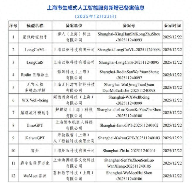 據(jù)悉截至2025年12月23日,上海市新增12款已完成備案的生成式人工智能服務(wù),累計(jì)已完成128款生成式人工智能服務(wù)備案。