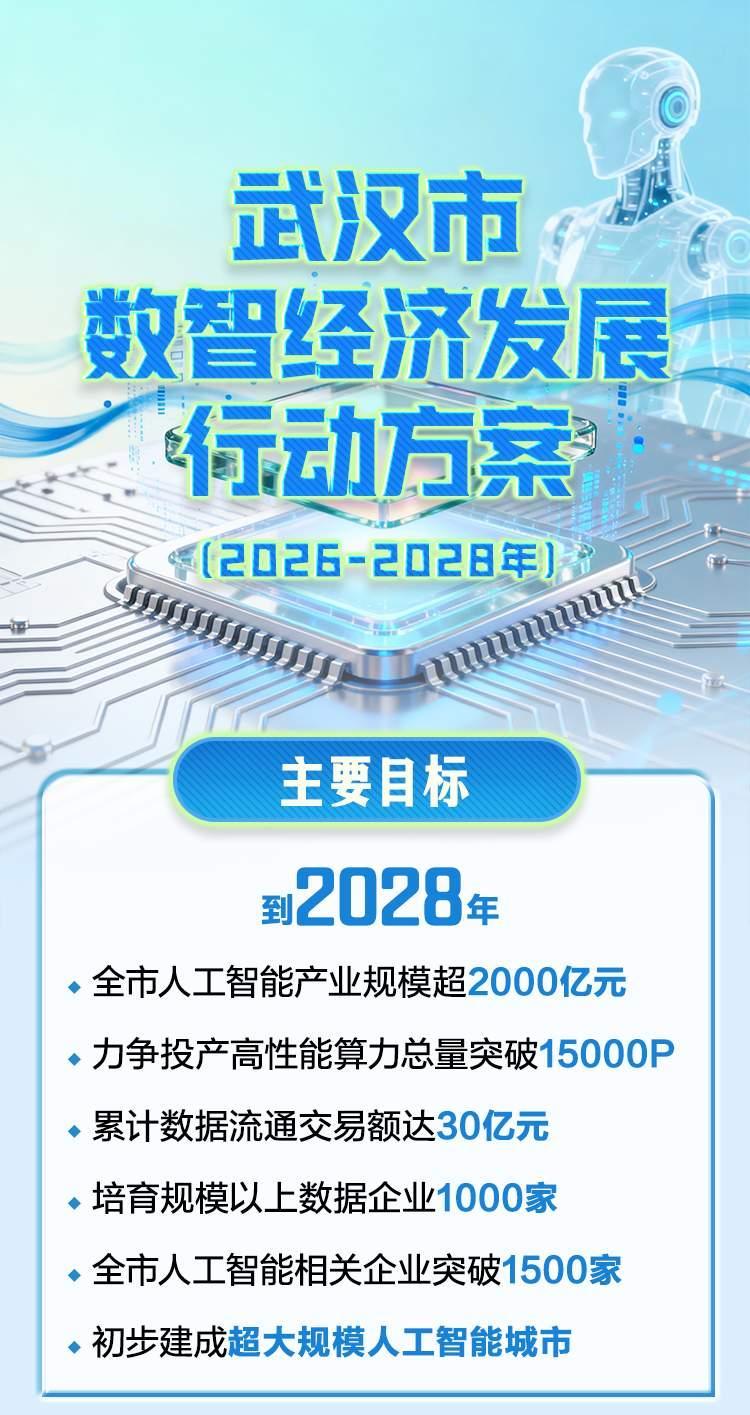 2026年2月3日,武漢全市數(shù)智經(jīng)濟一線城市建設(shè)大會舉行,正式發(fā)布《武漢市數(shù)智經(jīng)濟發(fā)展行動方案(2026—2028年)》,系統(tǒng)規(guī)劃未來三年武漢數(shù)智經(jīng)濟發(fā)展路徑。根據(jù)《方案》工作目標(biāo),到2028年,全市人工智能產(chǎn)業(yè)規(guī)模超2000億元,全市人工智能相關(guān)企業(yè)突破1500家,初步建成超大規(guī)模人工智能城市。錨定打造“全國數(shù)智經(jīng)濟一線城市”的目標(biāo),武漢將從產(chǎn)業(yè)發(fā)展、場景打造、基礎(chǔ)建設(shè)以及生態(tài)構(gòu)建等多方面協(xié)同發(fā)力,推動人工智能等數(shù)智技術(shù)與經(jīng)濟社會發(fā)展全方位結(jié)合。