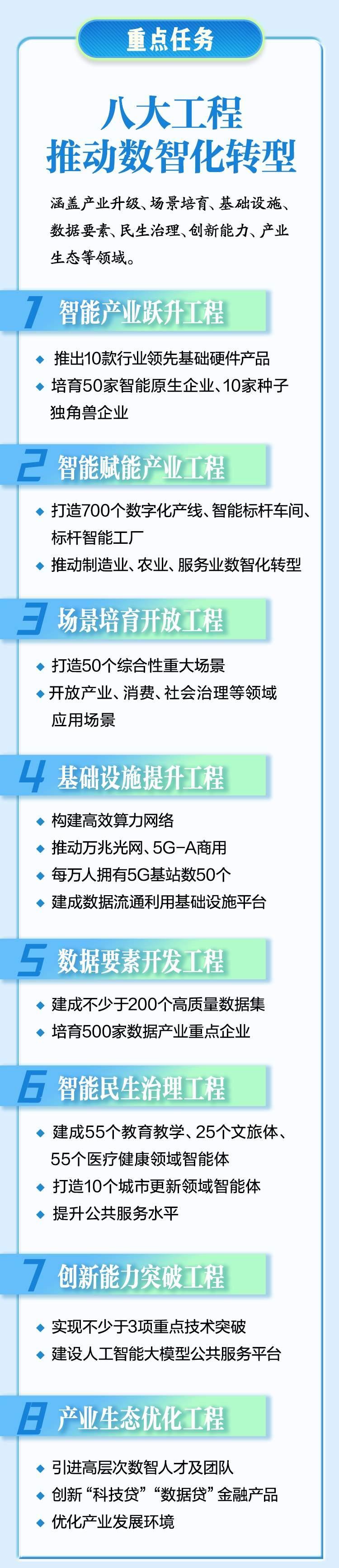 具體將聚焦產(chǎn)業(yè)升級、核心支撐、科技攻關(guān)、民生賦能等四大關(guān)鍵環(huán)節(jié),全鏈條實施八大重點工程,包括智能產(chǎn)業(yè)躍升、智能賦能產(chǎn)業(yè)、場景培育開放、基礎(chǔ)設(shè)施提升、數(shù)據(jù)要素開發(fā)、智能民生治理、創(chuàng)新能力突破和產(chǎn)業(yè)生態(tài)優(yōu)化,全面構(gòu)建數(shù)智經(jīng)濟“四梁八柱”。