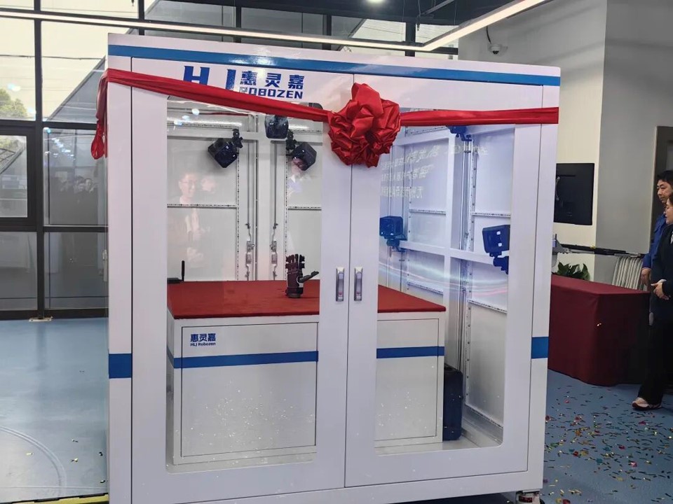 一個2米高的封閉玻璃箱內(nèi),10臺攝像機(jī)分布于不同的角度,聚焦一只機(jī)器人手,隨著手型的變化,相關(guān)數(shù)據(jù)傳輸?shù)诫娔X進(jìn)行分析。這是國內(nèi)首臺靈巧手靈巧性與運(yùn)動角度智能檢測設(shè)備。